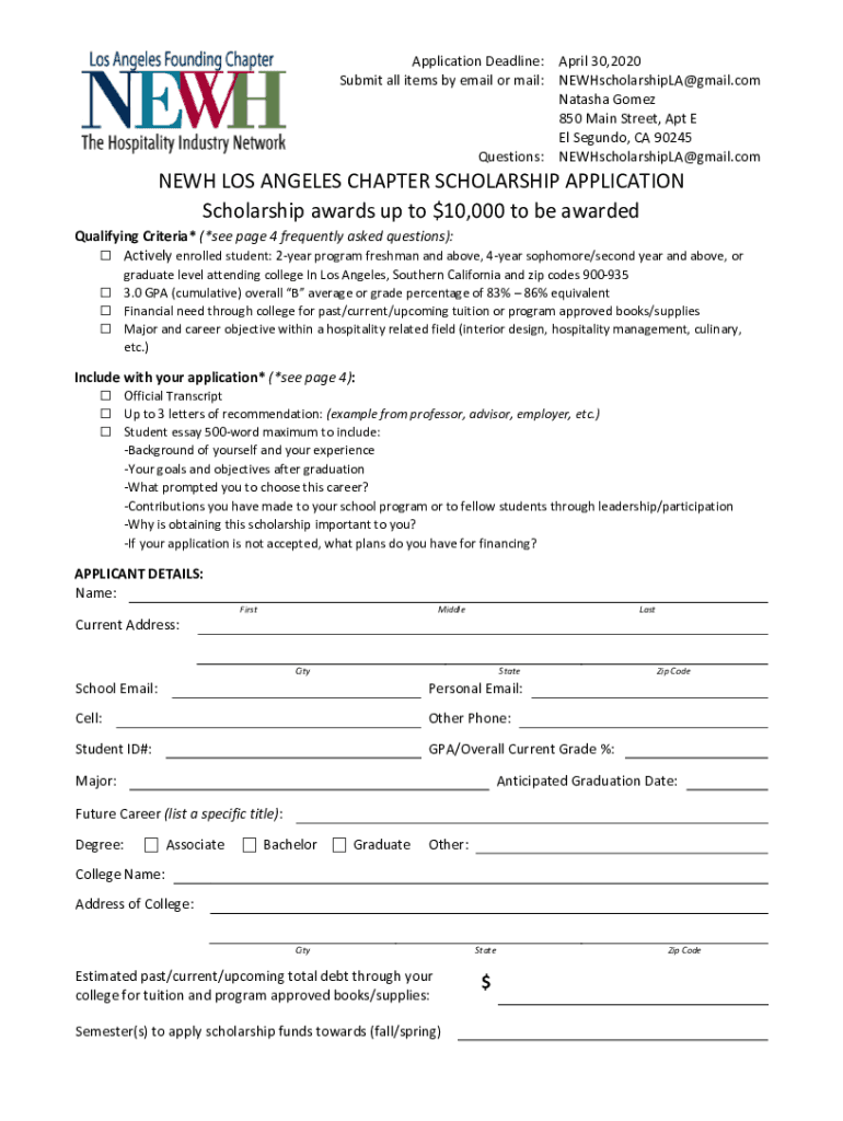 ApplicationDeadline: Submitallitemsbyemailormail: Questions:April30,2020 NEWHscholarshipLA@gmail.com Natasha Gomez 850MainStreet,Ate El Segundo,CA90245 NEWHscholarshipLA@gmail.comNEWHLOSANGELESCHAPTERSCHOLARSHIPAPPLICATION