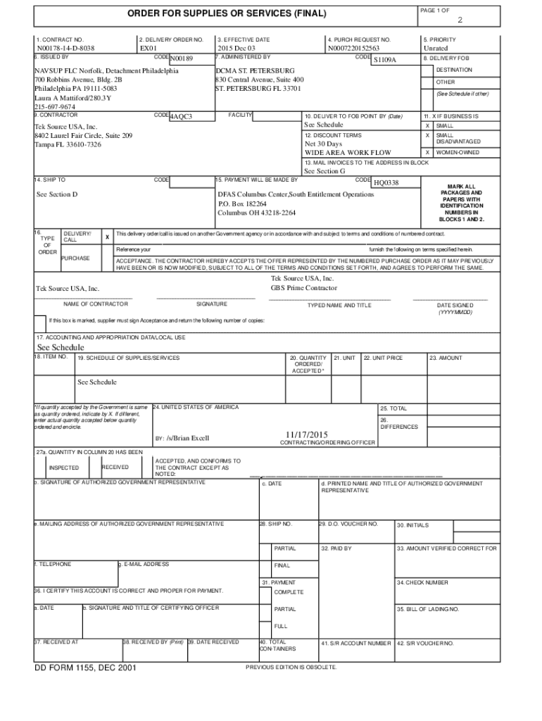 PAGE 1 FORMER FOR SUPPLIES OR SERVICES (FINAL)21. CONTRACT NO.2. DELIVERY ORDER NO.3. EFFECTIVE DATE4. PORCH REQUEST NO. N0017814D8038EX012015 Dec 03N00072201525636. ISSUED BECOME N001897. ADMINISTERED
