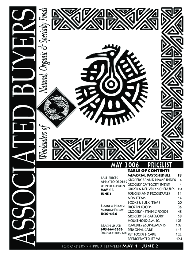 Natural, Organic & Specialty Foods Wholesalers associated BUYERS 2006PRICELISTTable of ContentsMEMORIAL DAY SCHEDULE18SALE PRICES GROCERY BRAND NAME INDEX 4 APPLY TO Order 4 shipped between GROCERY