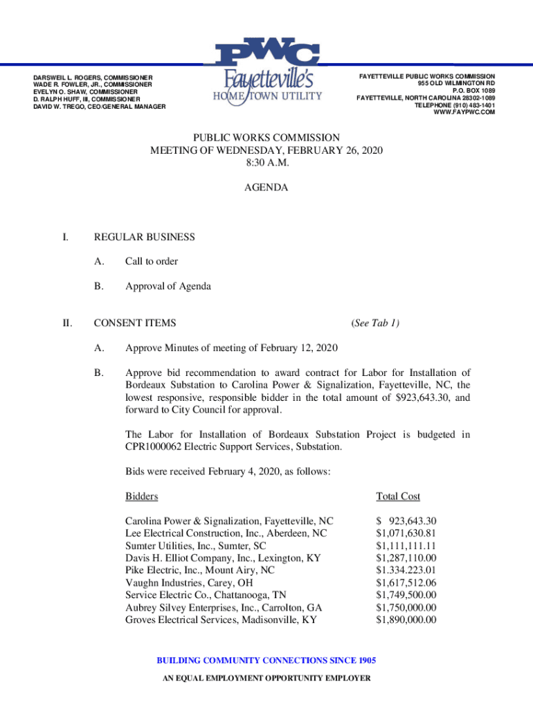 FAYETTEVILLE PUBLIC WORKS COMMISSION 955 OLD WILMINGTON RD P.O. BOX 1089 FAYETTEVILLE, NORTH CAROLINA 283021089 TELEPHONE (910) 4831401 WWW.FABRIC.COMDARSWEIL L. ROGERS, COMMISSIONER WADE R. FOWLER,