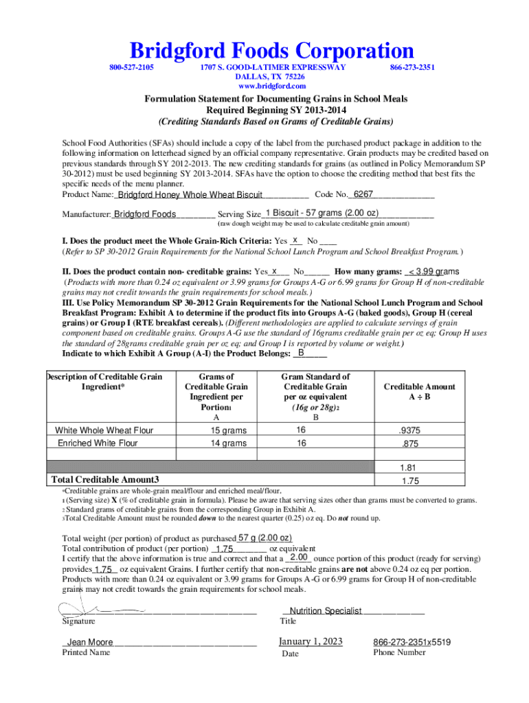 Bradford Foods Corporation 80052721051707 S. GOODLIER EXPRESSWAY DALLAS, TX 75226 www.bridgford.com8662732351Formulation Statement for Documenting Grains in School Meals Required Beginning SY 20132014