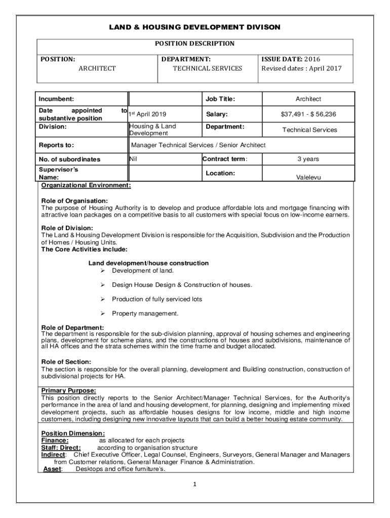 LAND & HOUSING DEVELOPMENT DIVISION POSITION DESCRIPTION POSITION:DEPARTMENT: TECHNICAL SERVICESARCHITECTIncumbent:ISSUE DATE: 2016 Revised dates : April 2017Job Title:Date appointed substantive position