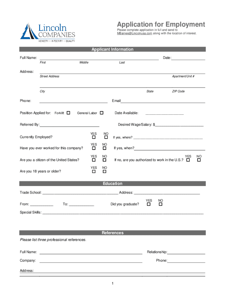 Application for Employment Please complete application in full and send to MBarnes@Lincolnusa.com along with the location of interest. Applicant Information Full Name:Date: FirstMiddleLastAddress: