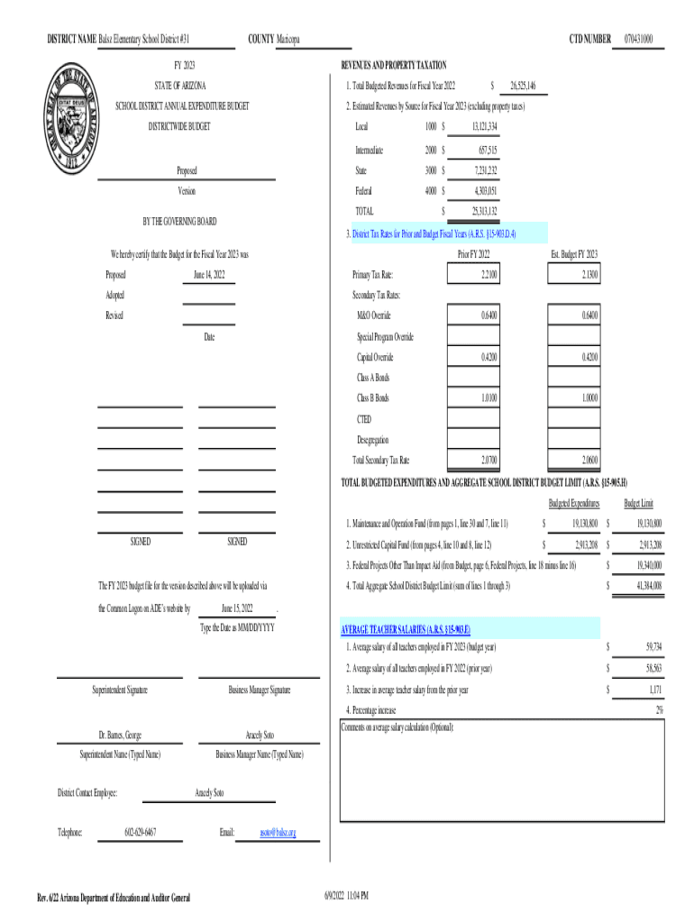 DISTRICT NAME Balsa Elementary School District #31COUNTY Maricopa 2023CTD NUMBER ##070431000REVENUES AND PROPERTY TAXATIONSTATE OF ARIZONA1. Total Budgeted Revenues for Fiscal Year 2022SCHOOL DISTRICT