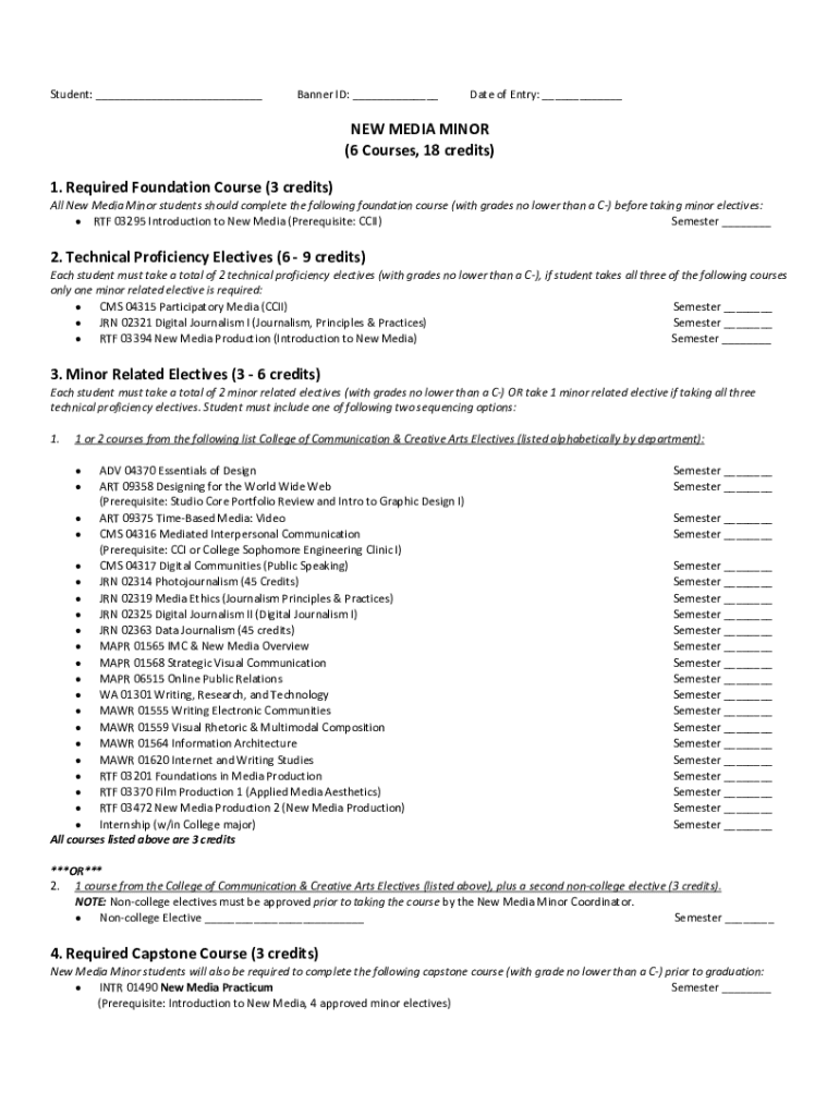 Get the free NEW MEDIA MINOR (6 Courses, 18 credits) 1. Required ...