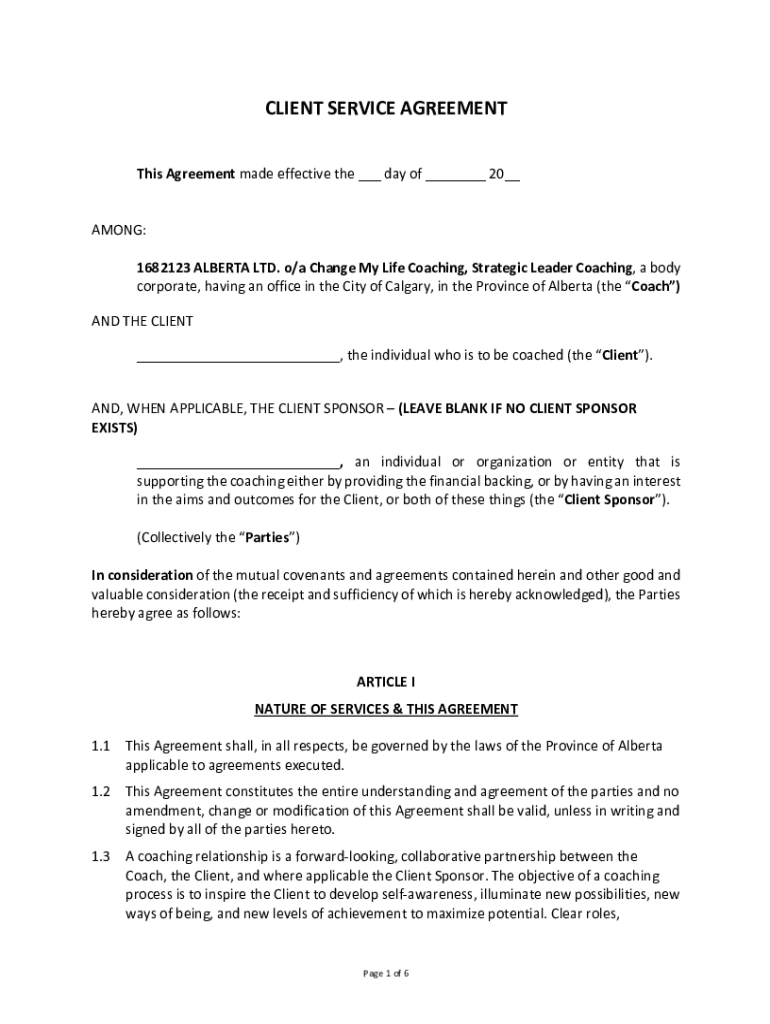 CLIENT SERVICE Agreements Agreement made effective the ___ day of ___ 20__AMONG: 1682123 ALBERTA LTD. O/a Change My Life Coaching, Strategic Leader Coaching, a body corporate, having an office in
