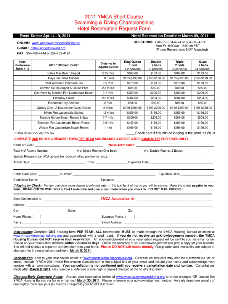 2011 YMCA Short Course Swimming & Diving Championships Hotel Reservation Request Form Event Dates: April 4 9, 2011Hotel Reservation Deadline: March 09, 2011, QUESTIONS: Call 8776644774 or 9547654774