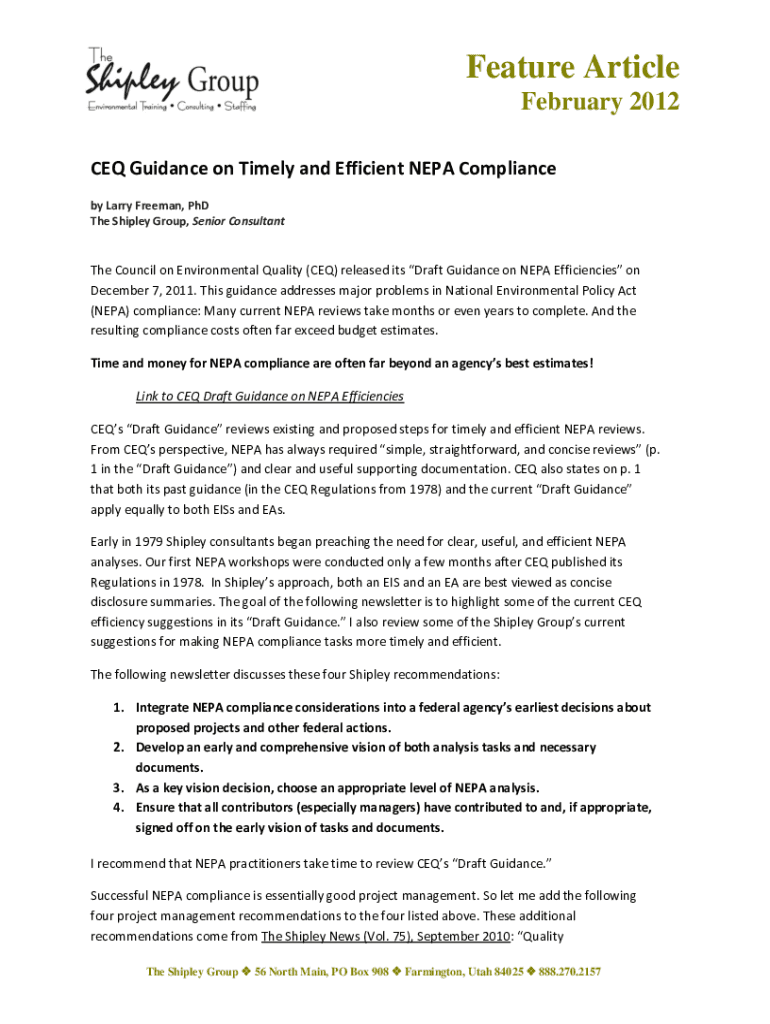Feature Article February 2012 CEQ Guidance on Timely and Efficient NEPAL Compliance by Larry Freeman, PhD The Shirley Group, Senior Consultant Council on Environmental Quality (CEQ) released its Draft