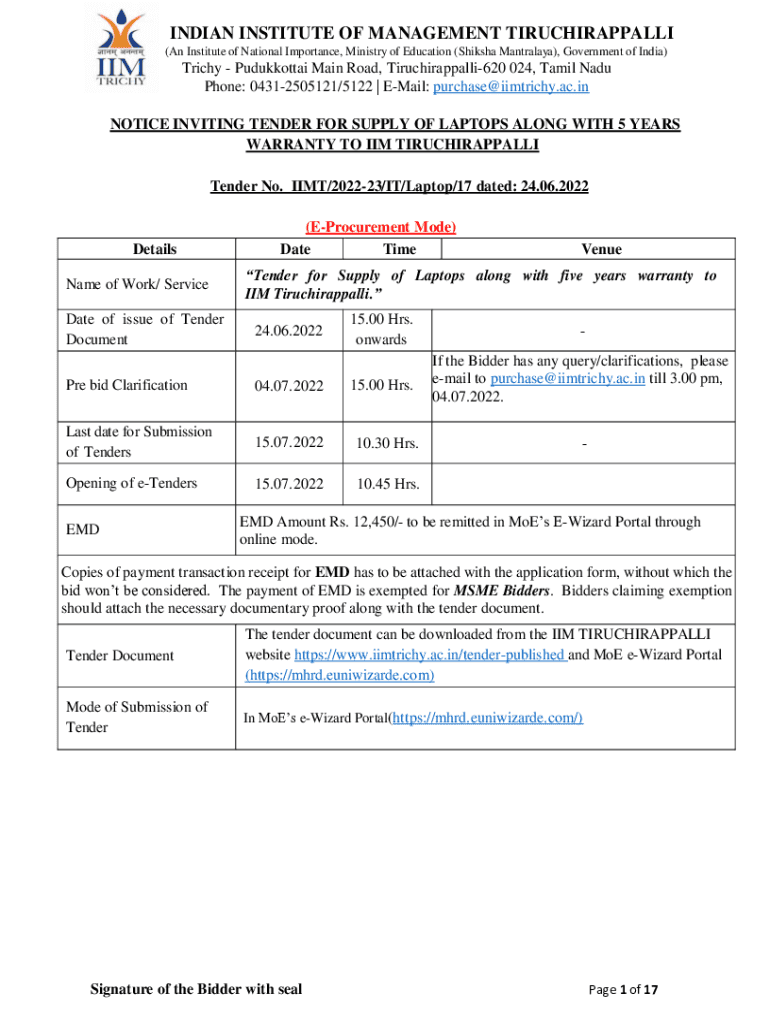 Any individual or entity involved in making purchases at IIM Trichy is required to file the contact information provided.