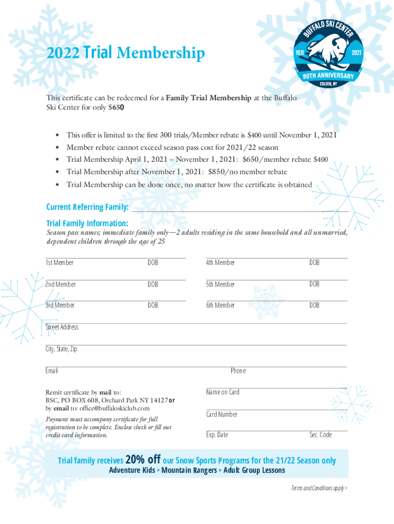 2022 Trial Membership This certificate can be redeemed for a Family Trial Membership at the Buffalo Ski Center for only $650 This offer is limited to the first 300 trials/Member rebate is $400 until
