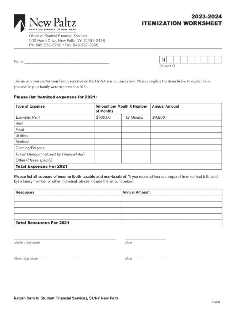 20232024 ITEMIZATION WORKSHEET S TAT E U N I V E R S I T Y O F N E W Y O R Office of Student Financial Services 200 Hawk Drive, New Waltz, NY 125612438 pH: 8452573250 Fax: 8452573568NName ___Student