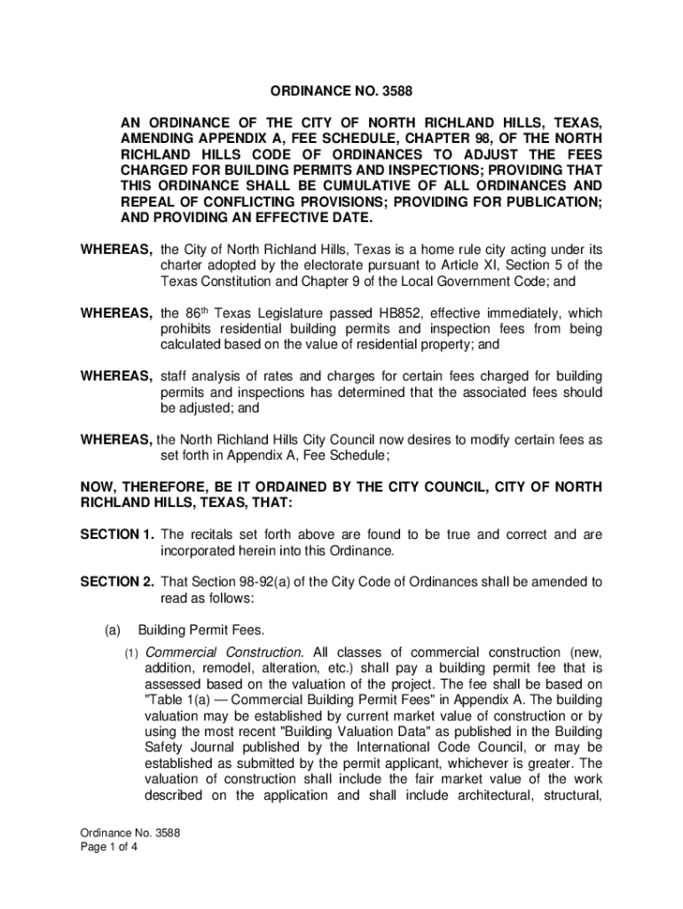 ORDINANCE NO. 3588 AN ORDINANCE OF THE CITY OF NORTH RICHLAND HILLS, TEXAS, AMENDING APPENDIX A, FEE SCHEDULE, CHAPTER 98, OF THE NORTH RICHLAND HILLS CODE OF ORDINANCES TO ADJUST THE FEES CHARGED