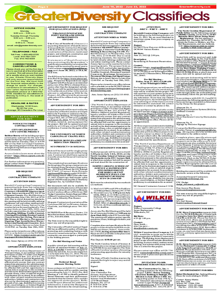 Page 8OFFICE HOURS Monday 9:00 a.m. 3:00 p.m. Tuesday through Thursday 9:00 a.m. 4:00 p.m. Friday 9:00 a.m. Noon email: ads@greaterdiversity.com___ TELEPHONE / FAX Toll Free: 18004620738 Local: 9107621337