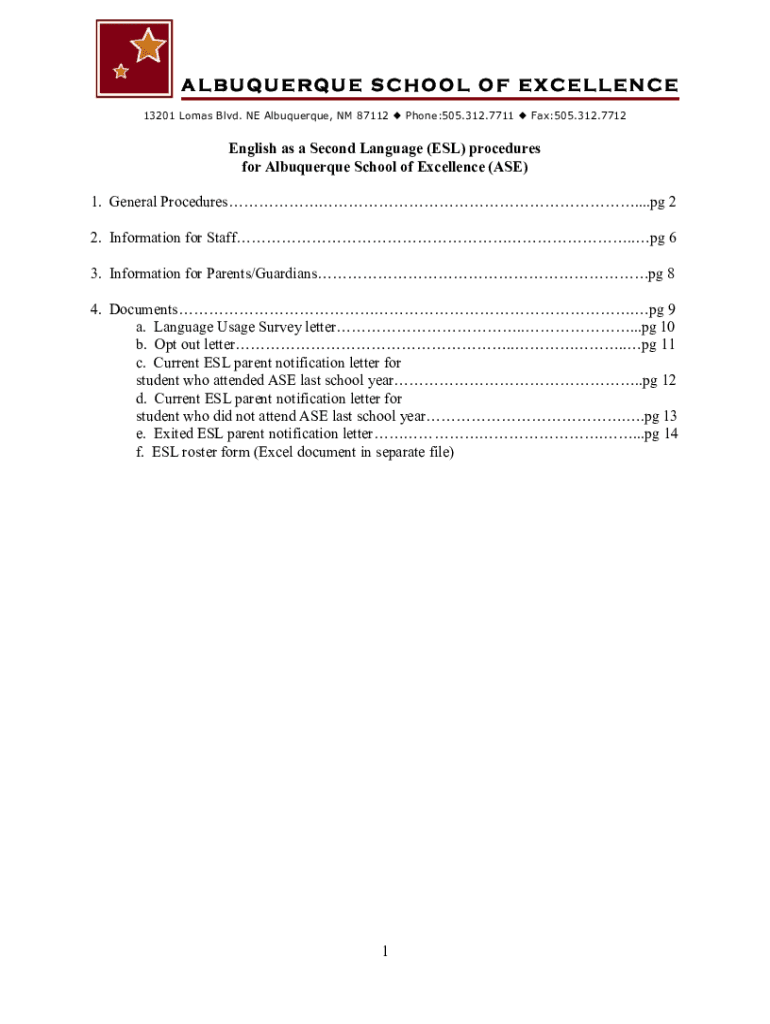 ALBUQUERQUE SCHOOL OF EXCELLENCE 13201 Lamas Blvd. NE Albuquerque, NM 87112 Phone:505.312.7711 Fax:505.312.7712English as a Second Language (ESL) procedures for Albuquerque School of Excellence (ASE)