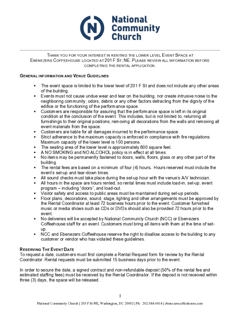 THANK YOU FOR YOUR INTEREST IN RENTING THE LOWER LEVEL EVENT SPACE AT EBENEZERS COFFEEHOUSE LOCATED AT 201 F ST, NE. PLEASE REVIEW ALL INFORMATION BEFORE COMPLETING THE RENTAL APPLICATION. GENERAL