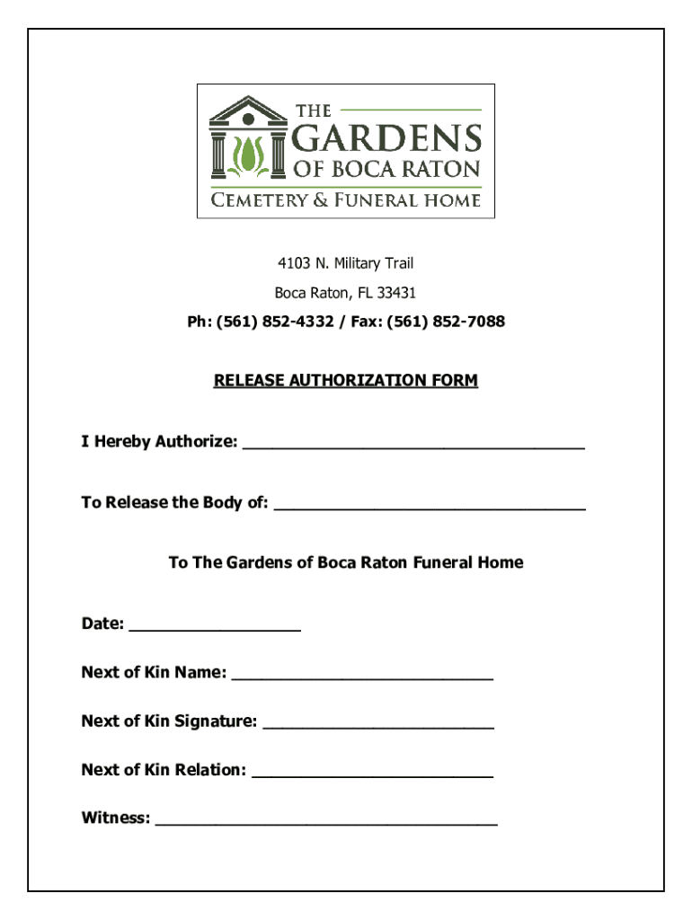 4103 N. Military Trail Boca Raton, FL 33431 pH: (561) 8524332 / Fax: (561) 8527088RELEASE AUTHORIZATION FORM Hereby Authorize: ___To Release the Body of: ___To The Gardens of Boca Raton Funeral Home