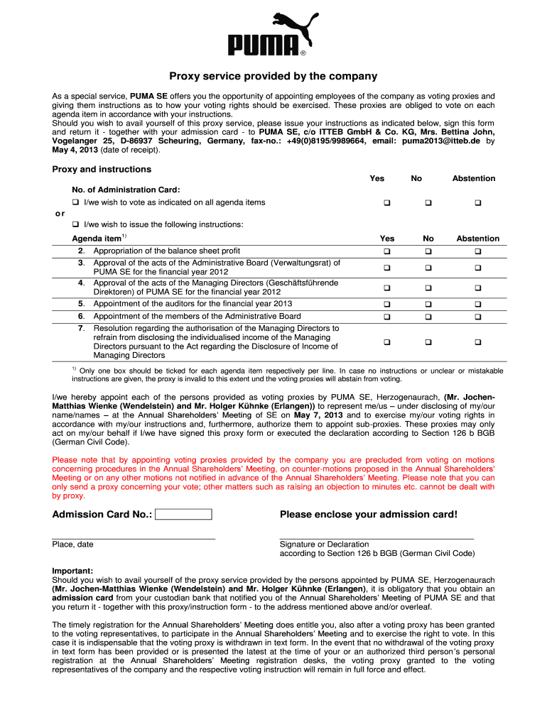 Proxy service provided by the company As a special service, PUMA SE offers you the opportunity of appointing employees of the company as voting proxies and giving them instructions as to how you're