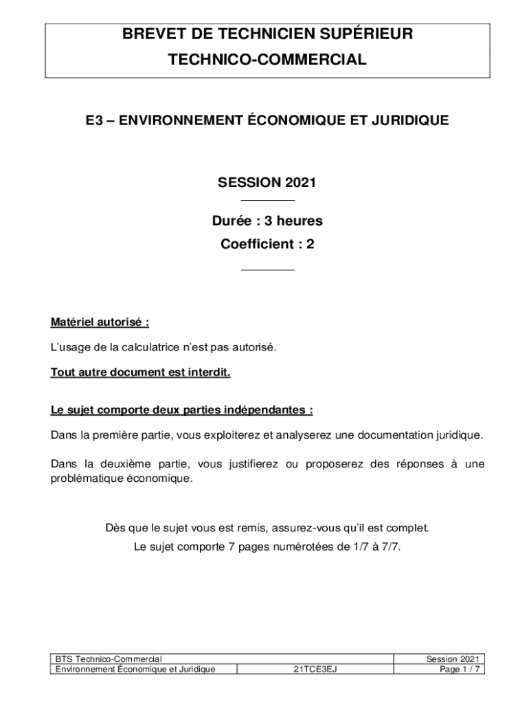 BREVET DE TECHNICIAN SPRIER TECHNICOCOMMERCIALE3 ENVIRONMENT CONTINUE ET JURIDIQUESESSION 2021 ___Due : 3 here Coefficients : 2 ___Material actors : Usage DE la calculative nest pas actors. Tout outré