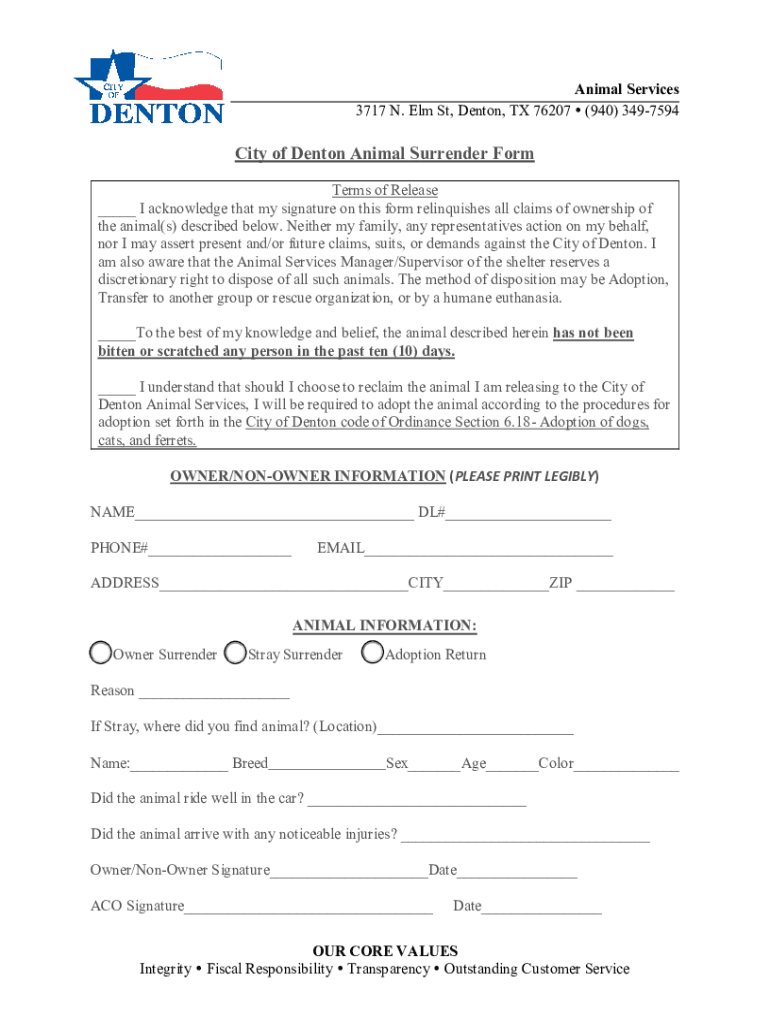 Animal Services 3717 N. Elm St, Denton, TX 76207 (940) 3497594City of Denton Animal Surrender Form Terms of Release ___ I acknowledge that my signature on this form relinquishes all claims of ownership
