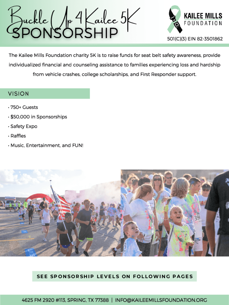 Buckle Up 4 Kaylee 5K 501(C)(3) EIN 823501862 The Kaylee Mills Foundation charity 5K is to raise funds for seat belt safety awareness, provide individualized financial and counseling assistance to