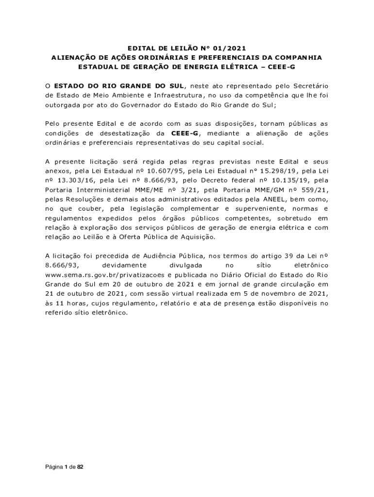 EDIT AL DE LEILA N 01/2021 ALIEN AO DE AES ORDINARIES E PREFERENCES DA COMPANY GRADUAL DE GERMAN DE ENERGY ERICA CE EEG O ESTATE DO RIO GRANDE DO SUL, nest ATO represent ado polo Secretion de Estado