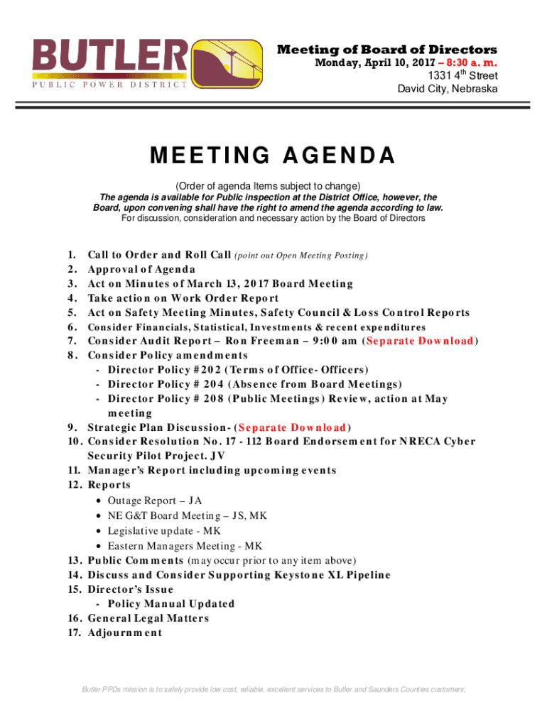 Meeting of Board of Directors Monday, April 10, 2017 8:30 a. m. 1331 4th Street David City, NebraskaMEETING AGENDA (Order of agenda Items subject to change) The agenda is available for Public inspection