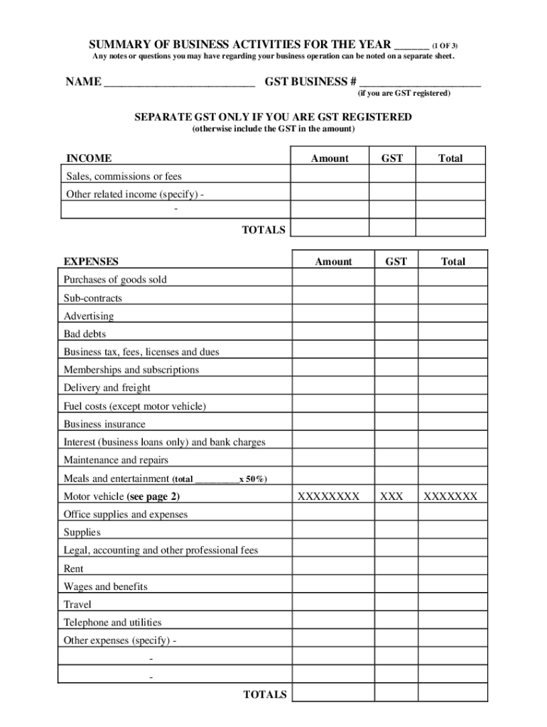 SUMMARY OF BUSINESS ACTIVITIES FOR THE YEAR ___ (1 OF 3) Any notes or questions you may have regarding your business operation can be noted on a separate sheet.NAME ___ GST BUSINESS # ___ (if you