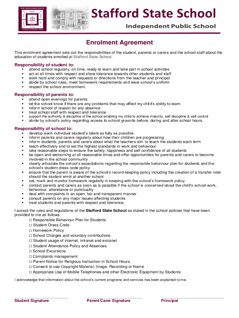 Enrollment Agreement This enrollment agreement sets out the responsibilities of the student, parents or carers and the school staff about the education of students enrolled at Stafford State School.