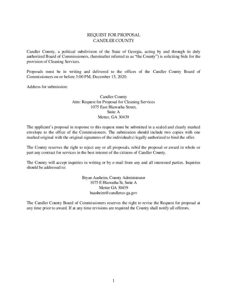 REQUEST FOR PROPOSAL CANDLER COUNTY, a political subdivision of the State of Georgia, acting by and through its duly authorized Board of Commissioners, (hereinafter referred to as the County) is soliciting