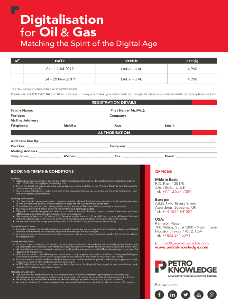 An Intensive 5-Day Training CourseDigitalisation for Oil & Mismatching the Spirit of the Digital Age03FEB1907 11 Jul 2019, Dubai 24 28 Nov 2019, Kuwaitis course is Designed, Developed, and will be