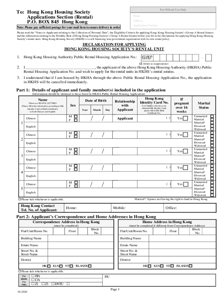 For Official Use Only: Hong Kong Housing Society Applications Section (Rental) P.O. BOX 845 Hong Longtime Address Application Cumbersome: Please pay sufficient postage for your mail item to ensure