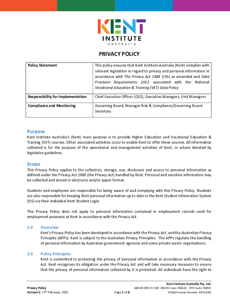 PRIVACY POLICY Statements policy ensures that Kent Institute Australia (Kent) complies with relevant legislation in regard to privacy and personal information in accordance with The Privacy Act 1988