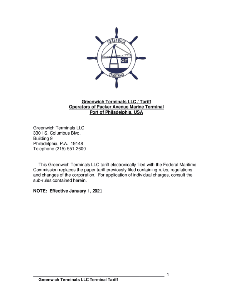 Greenwich Terminals LLC / Tariff Operators of Packer Avenue Marine Terminal Port of Philadelphia, USA Greenwich Terminals LLC 3301 S. Columbus Blvd. Building 9 Philadelphia, P.A. 19148 Telephone (215)