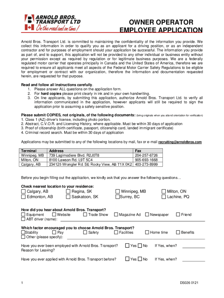 OWNER OPERATOR EMPLOYEE APPLICATION Arnold Bros. Transport Ltd. is committed to maintaining the confidentiality of the information you provide. We collect this information in order to qualify you