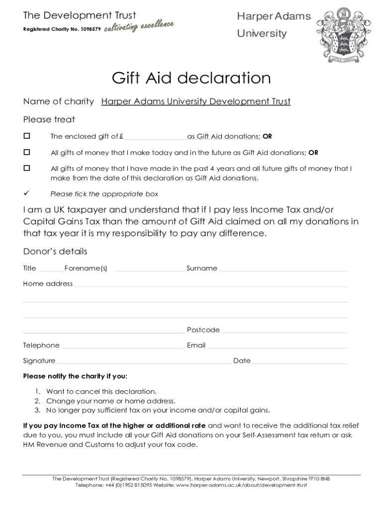The Development Trust Harper AdamsRegistered Charity No. 1098579UniversityGift Aid declaration Name of charity Harper Adams University Development Trust Please treat The enclosed gift of All gifts