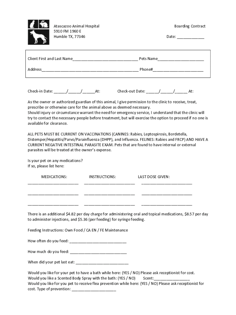 Atascadero Animal Hospital 5910 FM 1960 E Humble TX, 77346Boarding Contract Date: ___Client First and Last Name___ Pets Name___ Address___ Phone#___Checking Date: ___/___/___At:Checkout Date: ___/___/___