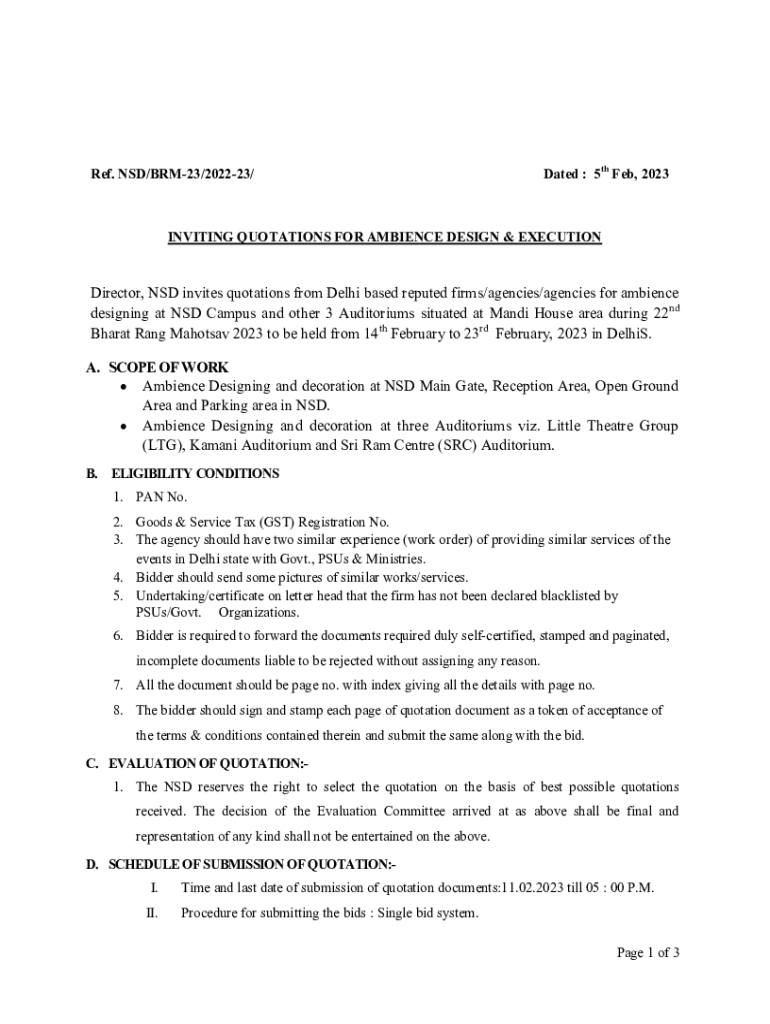 Ref. NSW/BRM23/202223/Dated : 5th Feb, 2023INVITING QUOTATIONS FOR AMBIENCE DESIGN & EXECUTIONDirector, NSW invites quotations from Delhi based reputed firms/agencies/agencies for ambience designing