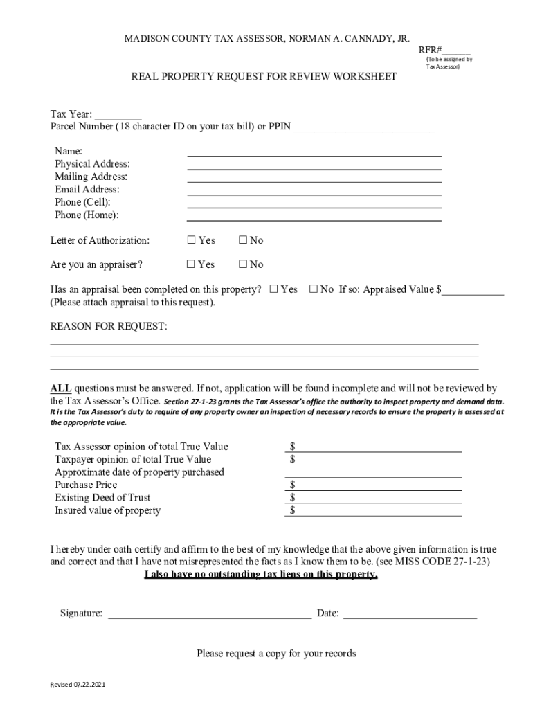 MADISON COUNTY TAX ASSESSOR, NORMAN A. CANADA, JR. RFR#___(Tobeassignedby Assessor)REAL PROPERTY REQUEST FOR REVIEW WORKSHEET Tax Year: ___ Parcel Number (18 character.