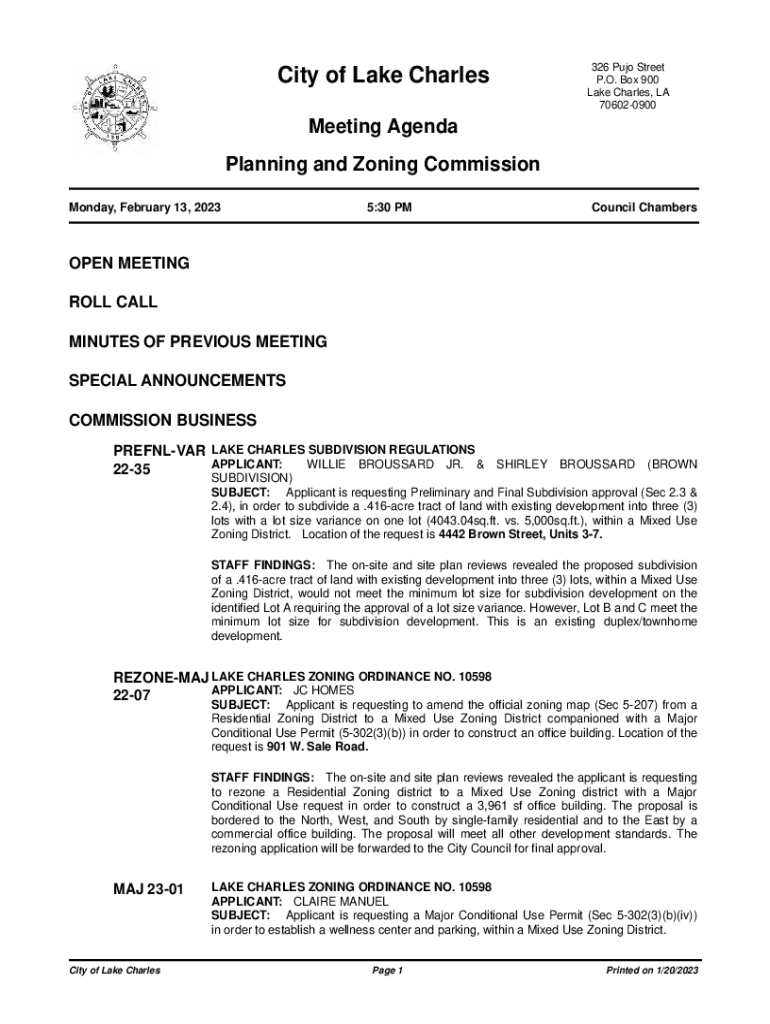 City of Lake Charles326 POJO Street P.O. Box 900 Lake Charles, LA 706020900Meeting Agenda Planning and Zoning Commission Monday, February 13, 20235:30 Council ChambersOPEN MEETING ROLL CALL MINUTES
