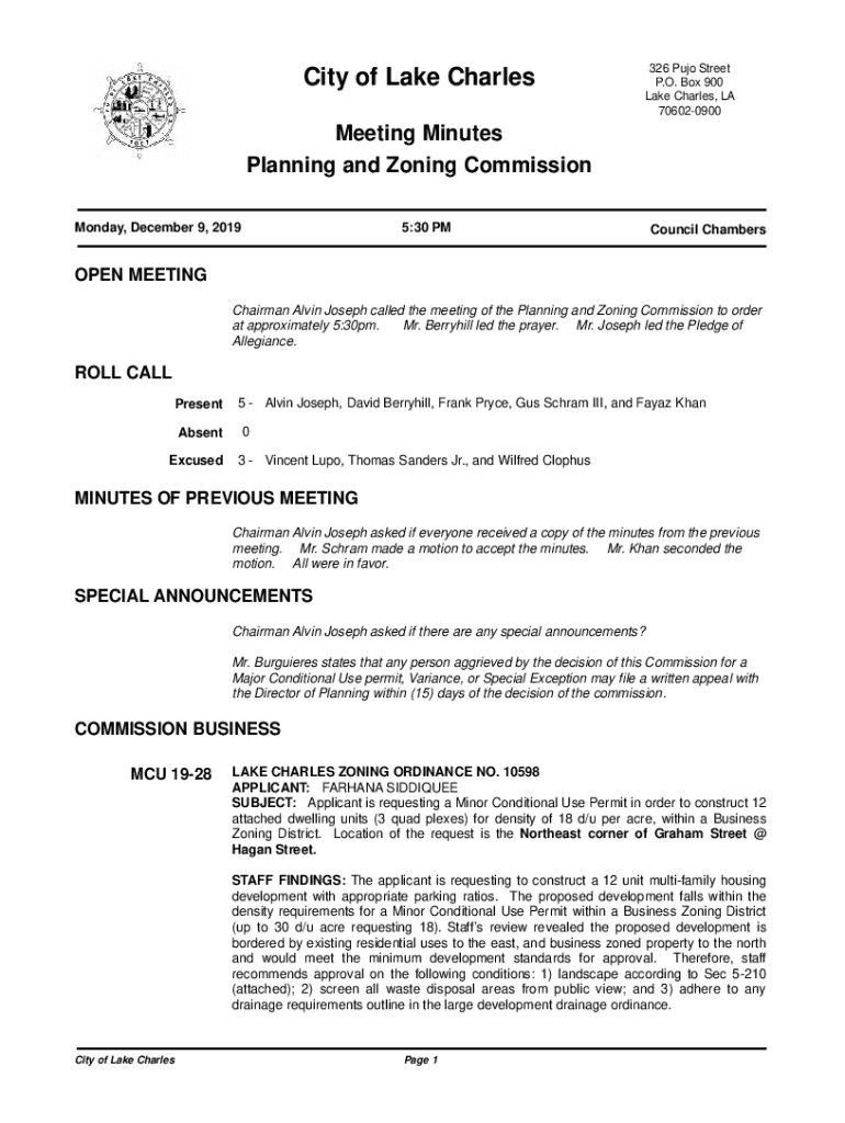 City of Lake Charles326 POJO Street P.O. Box 900 Lake Charles, LA 706020900Meeting Minutes Planning and Zoning Commission Monday, December 9, 20195:30 Council ChambersOPEN MEETING Chairman Alvin Joseph
