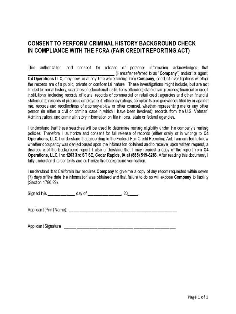 CONSENT TO PERFORM CRIMINAL HISTORY BACKGROUND CHECK IN COMPLIANCE WITH THE FCRA (FAIR CREDIT REPORTING ACT) This authorization and consent for release of personal information acknowledges that ___
