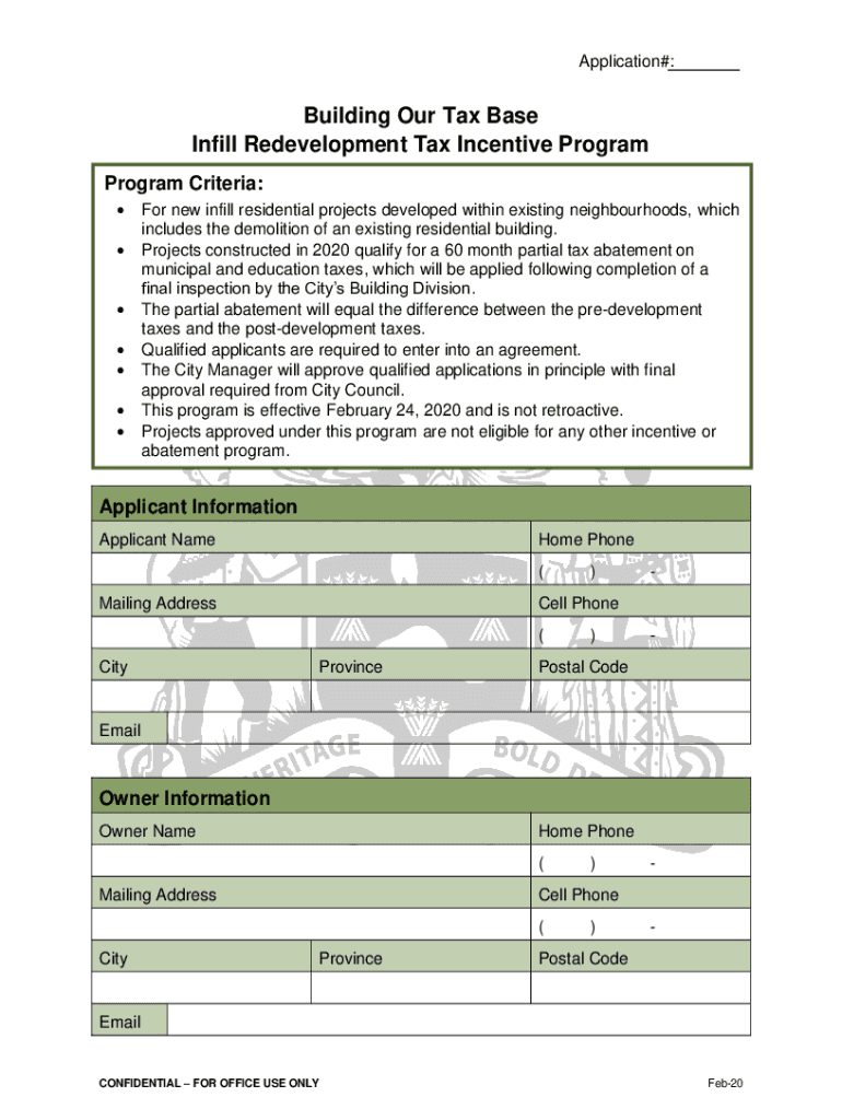 Application#:Building Our Tax Base Infill Redevelopment Tax Incentive Program Criteria: For new infill residential projects developed within existing neighborhoods, which includes the demolition of