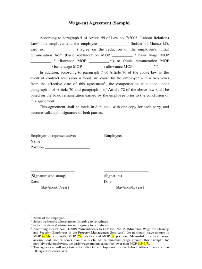 Wage cut Agreement (Sample) According to paragraph 5 of Article 59 of Law no. 7/2008 Labor Relations Law, the employer and the employee ___1 (holder of Macao I.D. card no. ___) agree on the reduction