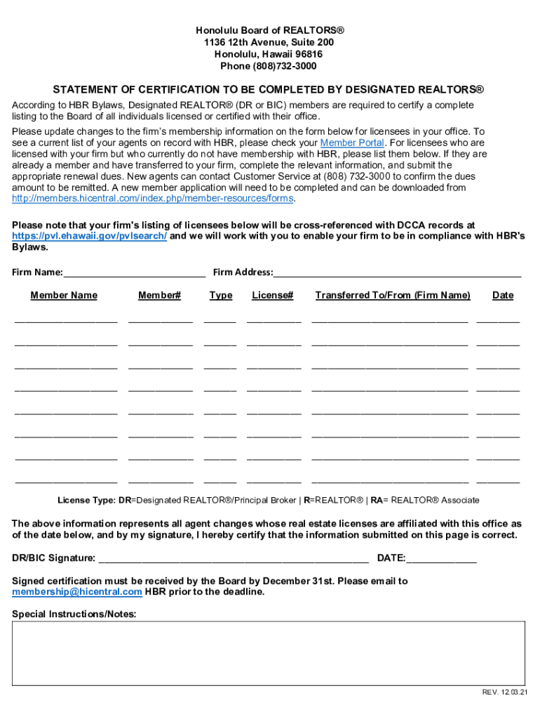 Honolulu Board of REALTORS 1136 12th Avenue, Suite 200 Honolulu, Hawaii 96816 Phone (808)7323000STATEMENT OF CERTIFICATION TO BE COMPLETED BY DESIGNATED REALTORS According to HER Bylaws, Designated