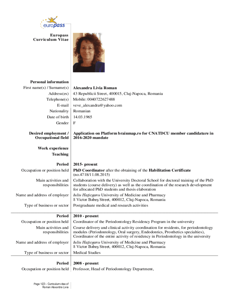 Euro pass Curriculum VitaePersonal information First name(s) / Surname(s) Address(BS) Telephone(s) Email Nationality Date of birth Gender Desired employment / Occupational field Alexandra Livia Roman