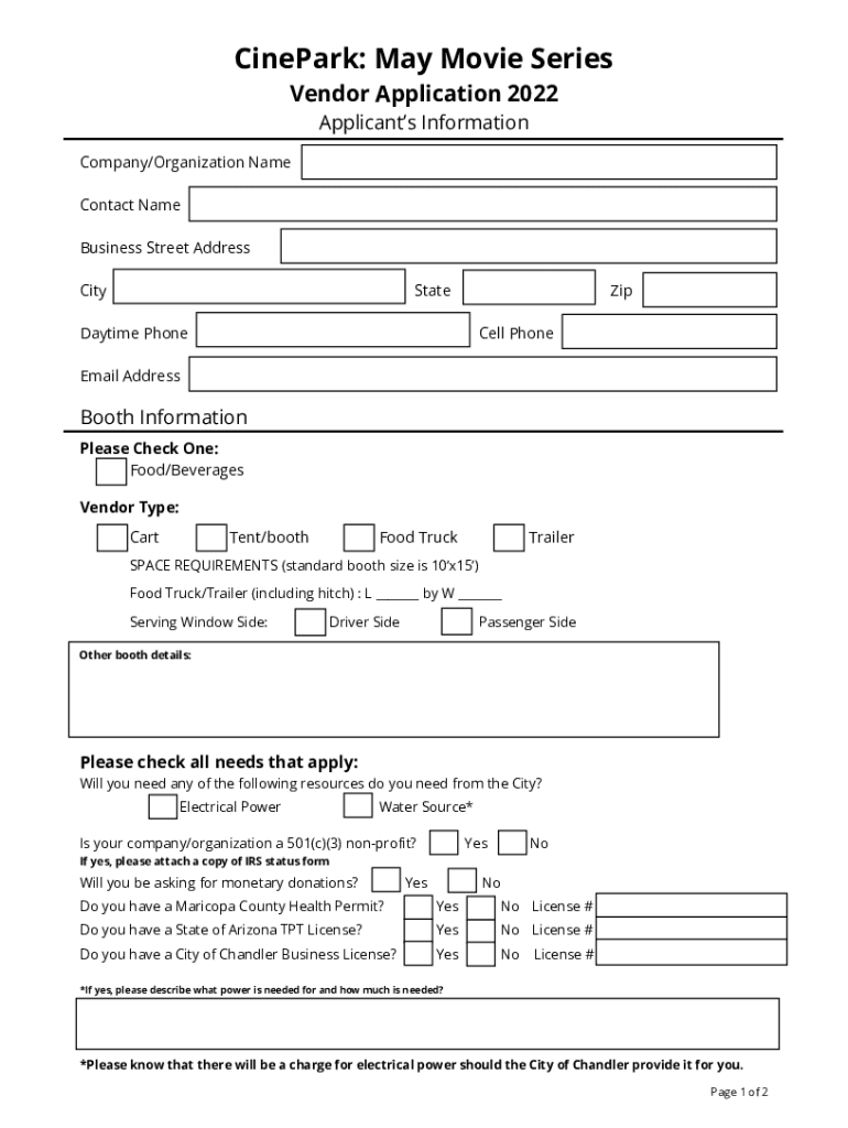 Cine Park: May Movie Series Vendor Application 2022 Applicants Information Company/Organization Name Contact Name Business Street Address CityStateZipDaytime Photocell Phonemic Address Booth Information