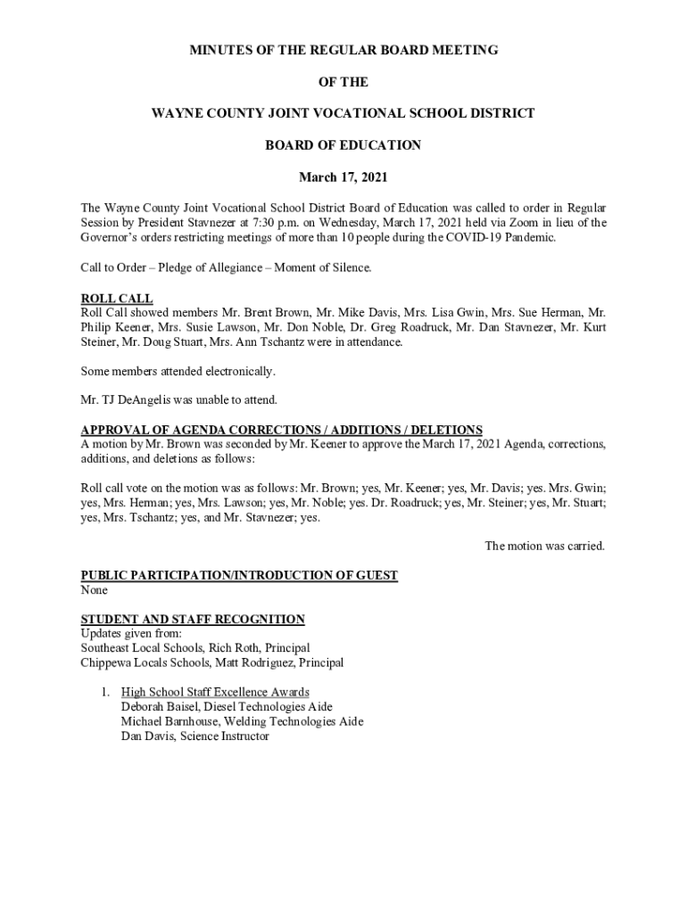 MINUTES OF THE REGULAR BOARD MEETING OF THE WAYNE COUNTY JOINT VOCATIONAL SCHOOL DISTRICT BOARD OF EDUCATION March 17, 2021, The Wayne County Joint Vocational School District Board of Education was