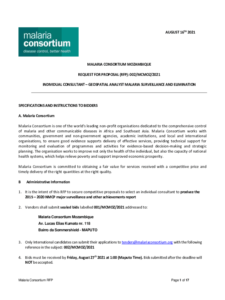 AUGUST 16TH 2021MALARIA CONSORTIUM MOZAMBIQUE REQUEST FOR PROPOSAL (RFP): 002/MC MOZ/2021 INDIVIDUAL CONSULTANT GEOSPATIAL ANALYST MALARIA SURVEILLANCE AND ELIMINATIONSPECIFICATIONS AND INSTRUCTIONS