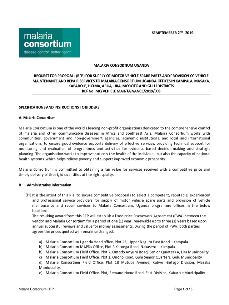 SEPTEMBER 2ND 2019MALARIA CONSORTIUM UGANDA REQUEST FOR PROPOSAL (RFP) FOR SUPPLY OF MOTOR VEHICLE SPARE PARTS AND PROVISION OF VEHICLE MAINTENANCE AND REPAIR SERVICES TO MALARIA CONSORTIUM UGANDA