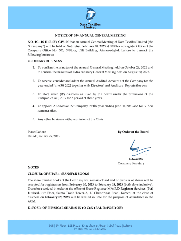 NOTICE OF 35th ANNUAL GENERAL MEETING NOTICE IS HEREBY GIVEN that an Annual General Meeting of Data Textiles Limited (the Company) will be held on Saturday, February 18, 2023, at 1000hrs at Register